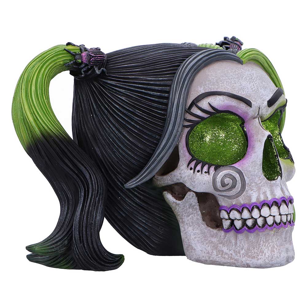 The Drop Dead Gorgeous Beetles and Bugs Skull is a striking Nemesis Now original, perfect for fans of gothic decor and creepy-cute collectibles. Featuring a bold and black and green colour scheme, its adorned with sparkling green glitter in the eye sockets and detailed bugs nestled atop twisted pigtails. Packaged in a branded gift box, it’s ideal for gifting or displaying. Whether youre into alternative home decor, horror-themed pieces, or simply love the weird and wonderful, this bugged-out beauty is a must-have for your collection.