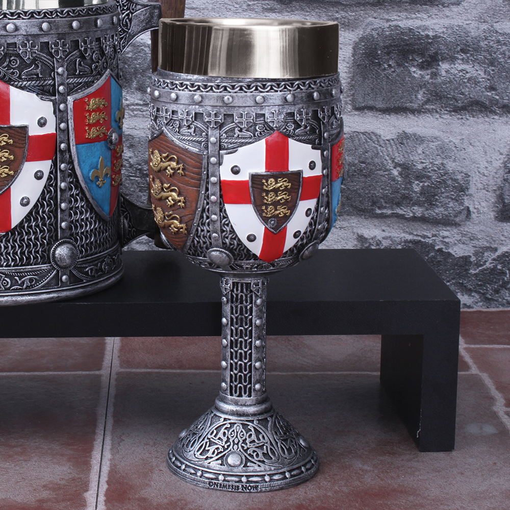 Drink to your health with 1000 years of proud English history with this sturdy goblet, created by Nemesis Now. Cast in the finest resin, this high-quality goblet is painstakingly hand painted to look armoured, with rivets holding chainmail in place. The body of the goblet is emblazoned with shields bearing heraldic designs, such as the cross of St. George, the royal arms of Henry IV, or 3 lions, leaving no doubt as to the heritage invoked. With a removable stainless steel insert for ease of cleaning, this goblet makes a perfect gift for anyone proud of their English heritage.