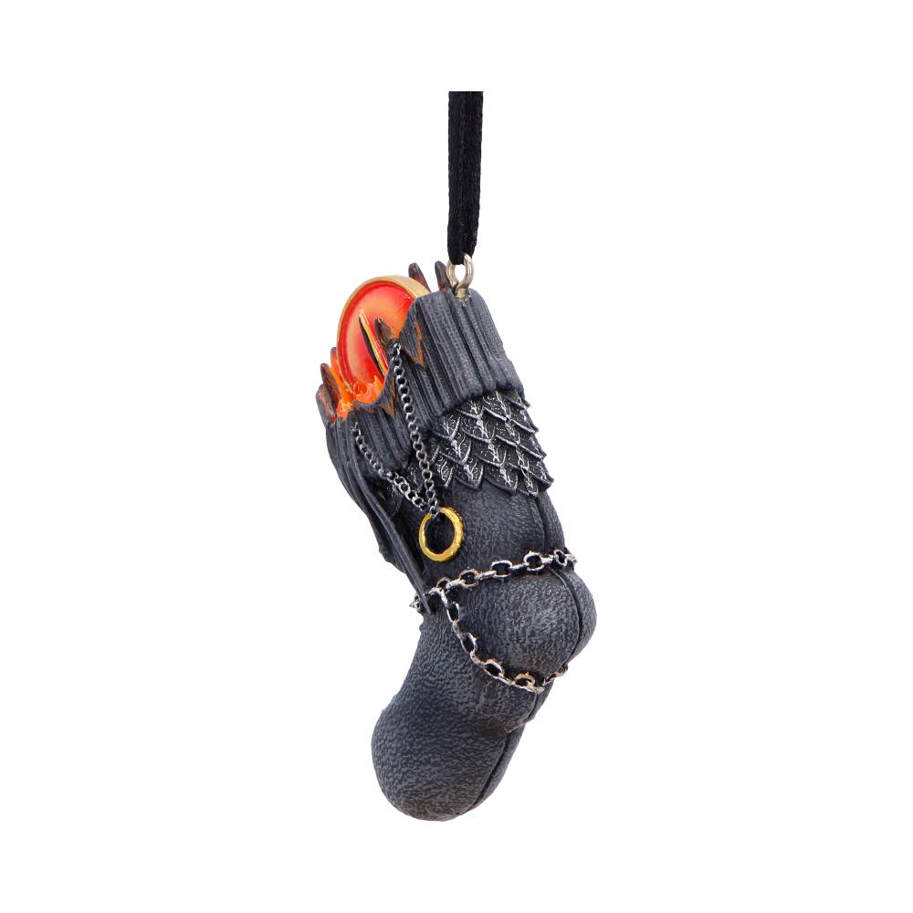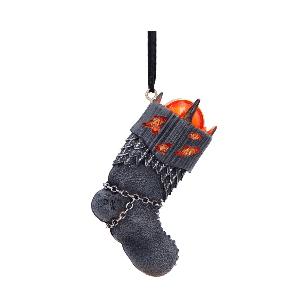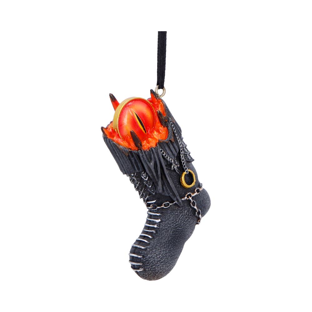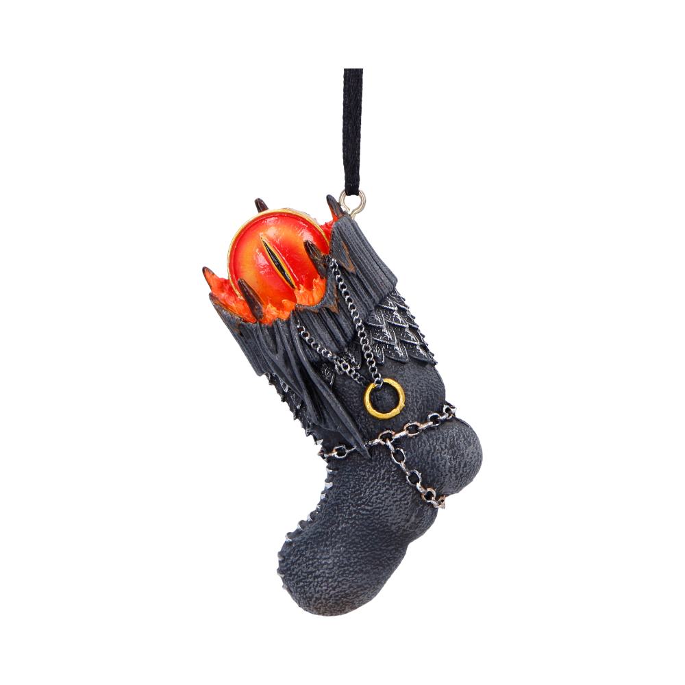 Bring a touch of Middle-earth to your festive decor with this officially licensed Lord of the Rings Sauron Stocking Hanging Ornament. Shaped like a small stocking and designed after the Dark Tower, it features the iconic eye of Sauron watching from the top. With intricate detailing, a hand-painted finish, and a gold hanging loop, its perfect for fans of Tolkiens epic world. Packaged in a branded gift box, its ideal for gifting or adding a unique twist to your own holiday collection. A must-have ornament for any Lord of the Rings fan.